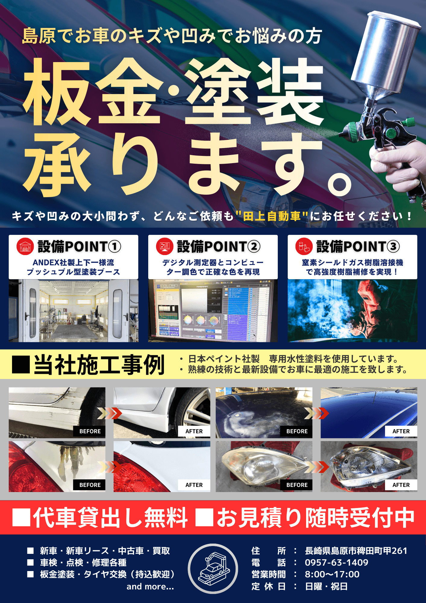 また、塗装専用ブースや専用設備を取り揃え、繊細丁寧に実施し各種板金塗装に対応いたしております!